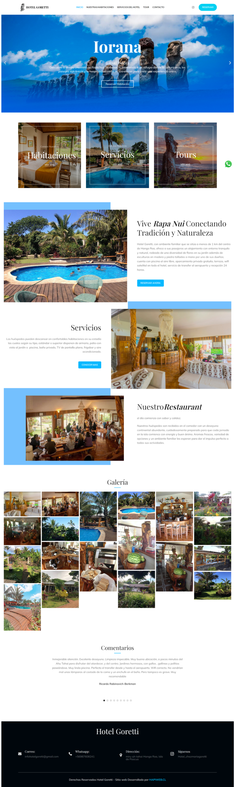 Hemos desarrollado una página web moderna y acogedora para Hotel Goretti, un hotel ubicado en la hermosa Isla de Pascua, enfocado en ofrecer una experiencia de alojamiento cómoda, tranquila y cercana. Nuestro objetivo es que su presencia digital refleje la hospitalidad, el descanso y la conexión con la cultura y el entorno natural de Rapa Nui, facilitando a los visitantes la información y reserva de su estadía de forma clara y confiable.